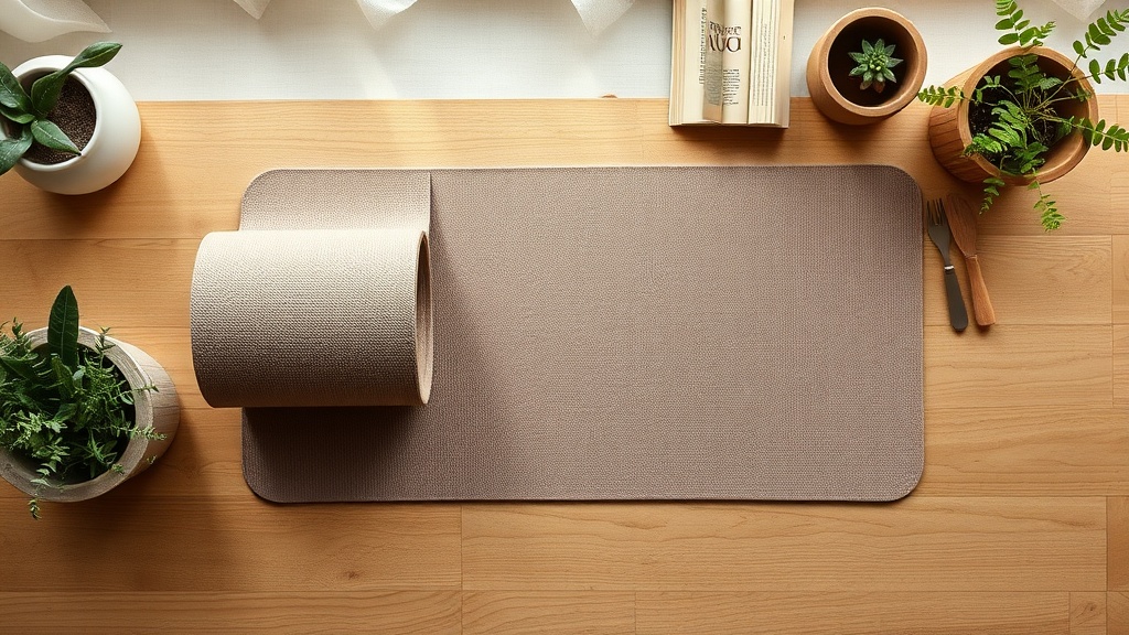 Pick a plain natural rubber, cork, or jute yoga mat. Wipe with a vinegar-water spray after class to keep it clean.